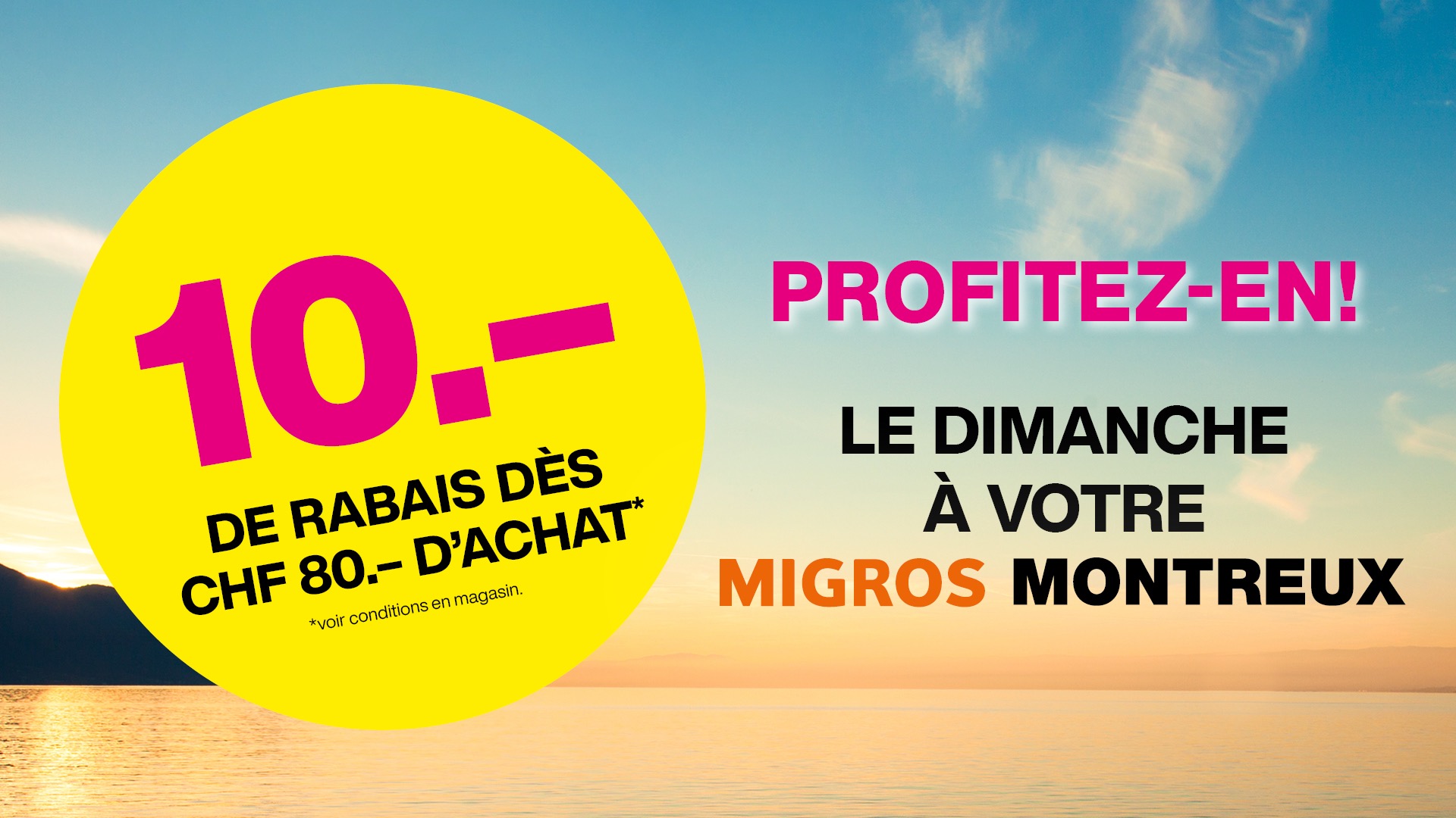 Tous les dimanches, recevez *CHF 10.– de rabais dès CHF 80.– d’achat ! Ne ratez pas cette bonne affaire !