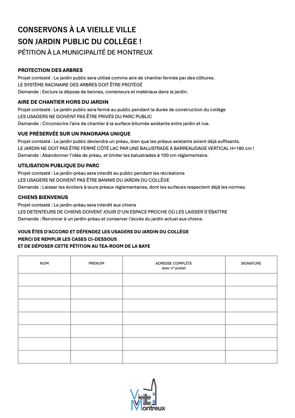 L’Association Vieille Ville de Montreux fait une pétition contre l’affectation du parc Montreux-Est en préau scolaire.