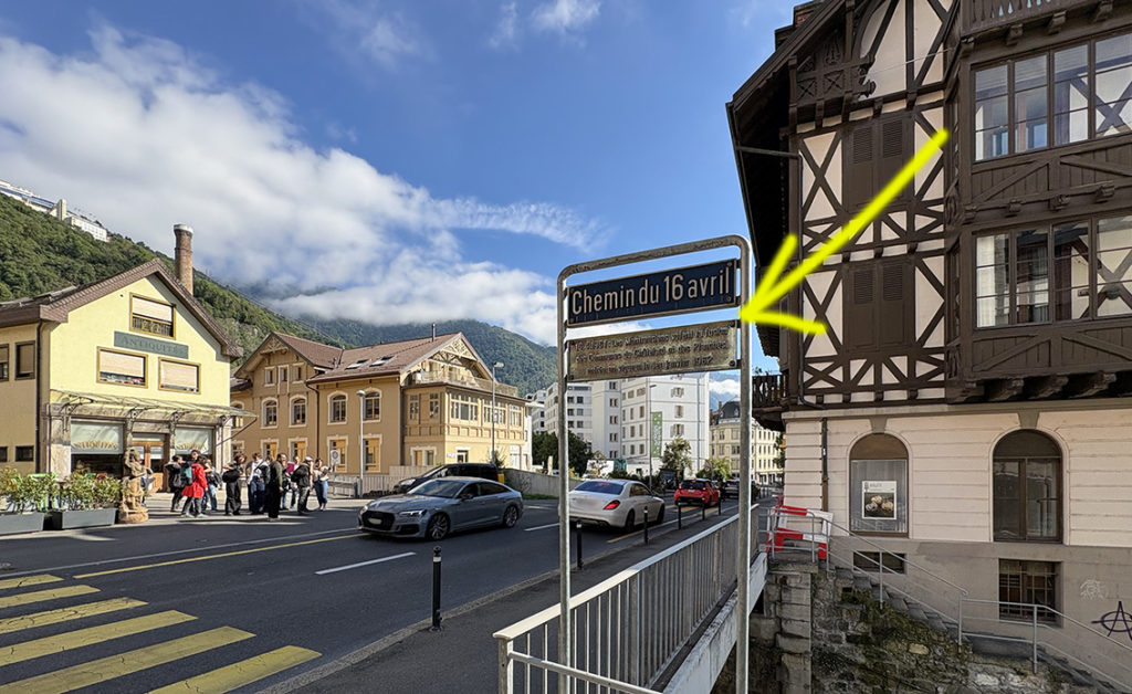 L’extrait d’image publié vendredi passé représentait ce panneau sur le pont de la Baye, indiquant le «Chemin du 16 avril 1961», date à laquelle les citoyens ont accepté la fusion des communes du Châtelard et des Planches (Veytaux ayant refusé). Le glacier Séchaud, à cheval sur les deux communes, avait placé un tonneau sur sa terrasse pour offrir un verre…